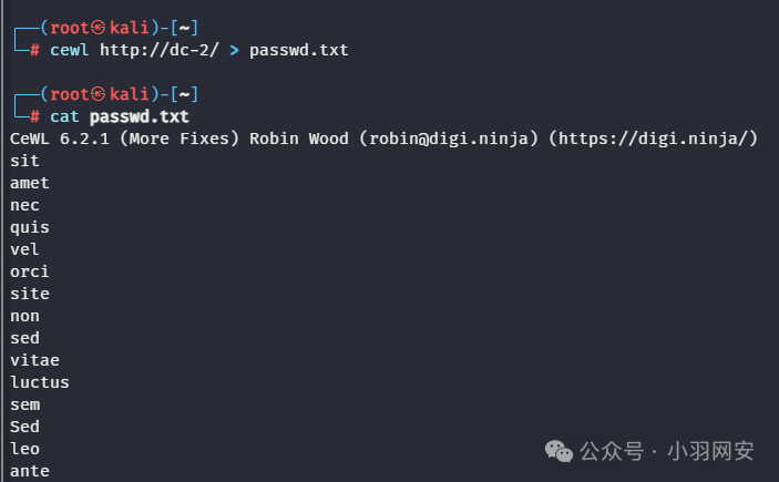 我们将扫描结果重定向到passwd.txt(就是保存文件或者使用cewl的自带的-m参数)