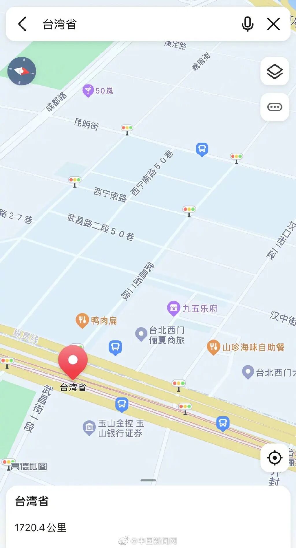 记者注意到,常用的地图软件已可以检索到台湾省的详细位置信息,包括街道、建筑,甚至小到美食店铺。