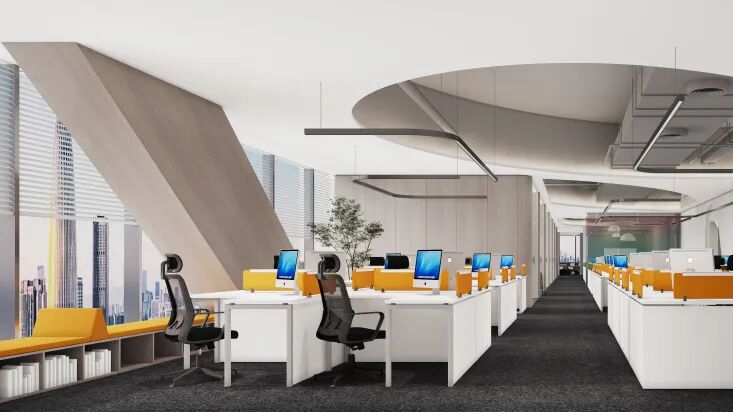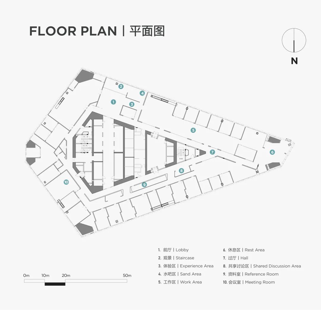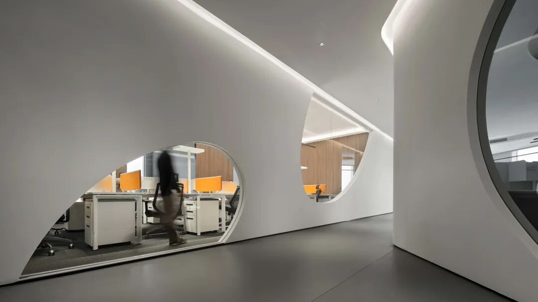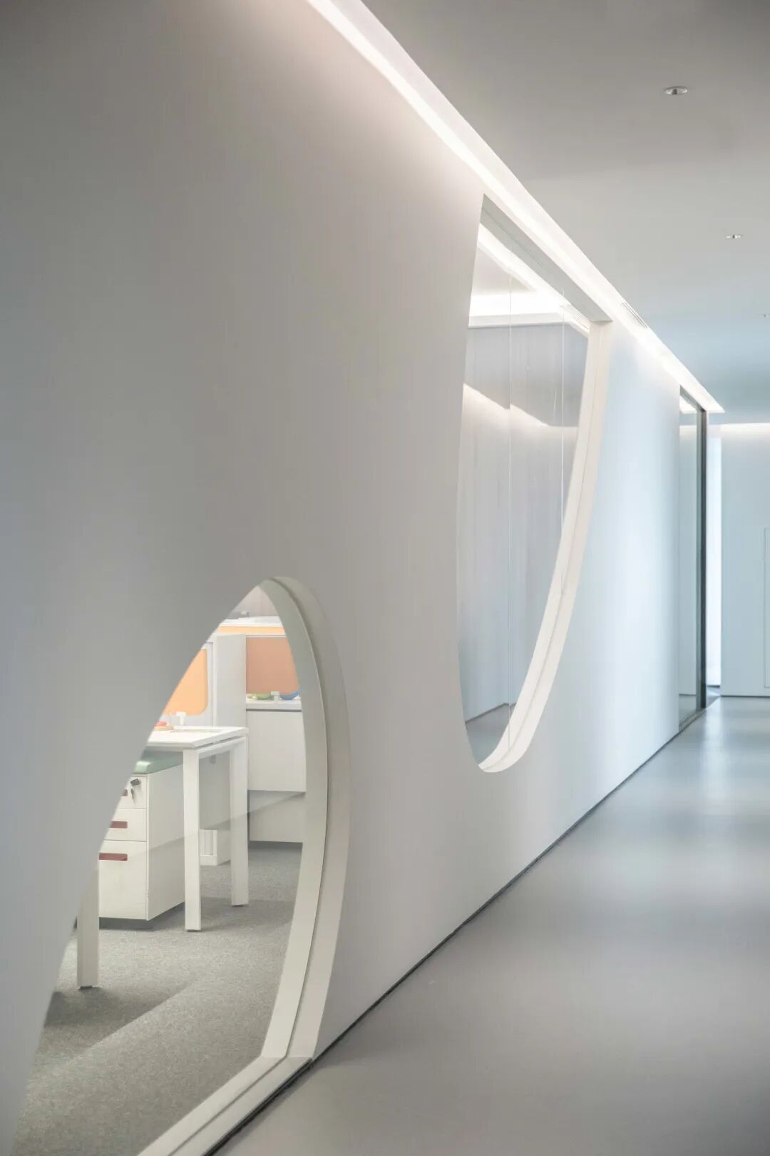 提及游乐公园,首先浮现在脑海中的印象里想来过山车必有一席之地。以此为意象,过山车起伏的轨道转化为部门空间与过道间墙体上的弧线,线条勾勒出的范围以玻璃填充,点缀之余也让空间的体量感更加明晰,各个区域间的视觉得以贯通。