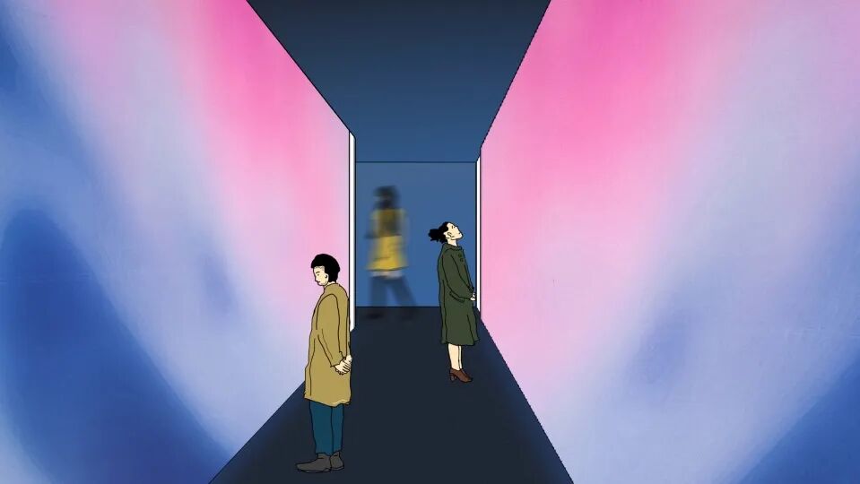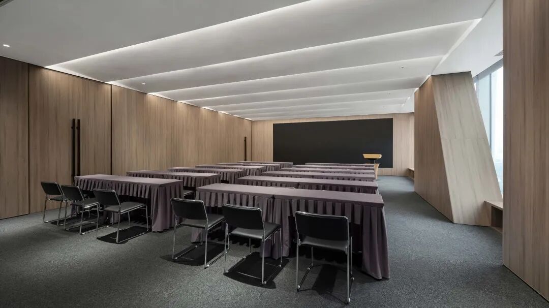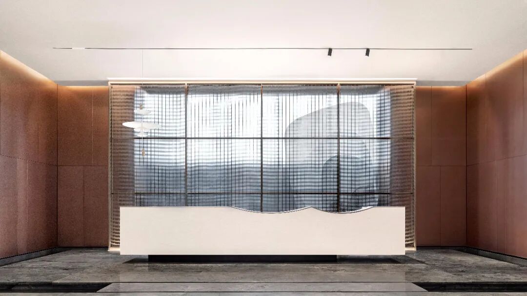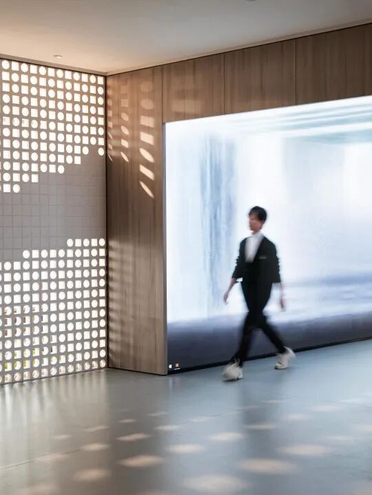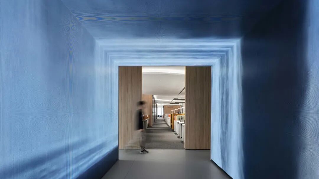 通往办公区域的走道三面环绕电子屏,大面积的电子屏幕使用在最大程度上增强了感官效果。不仅为经过走道的这一段路带来沉浸式体验,也卸下了一些固有印象中办公场所正式并且传统的感觉,以安静的形式增添动态的活力。