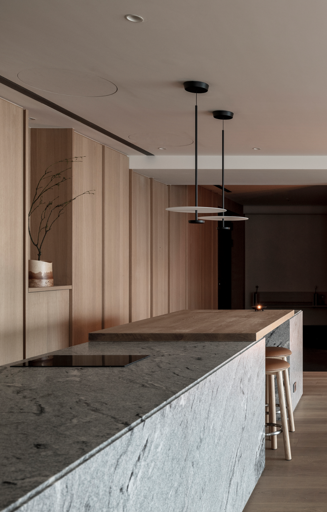 刻意窄化狭长玄关,黑色地面更显曲径通幽之雅,对比悬浮片墙后一室开阔,自然营造戏剧性扩张流动感。