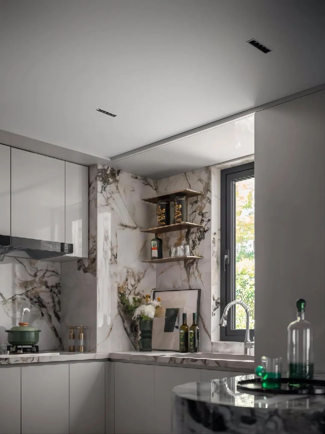 源于自然的绿意在空间内无限蔓延,打破层层界限,重新构筑生活场景,描绘新幸福指数生活蓝图。线条的张力造就空间逻辑性构造的框架,在简洁干练的界面下通过几抹绿色石材的点缀,在秩序中传递着独特的优雅。翠出生趣但又不显浓郁的餐厅,做为把酒言欢的惬意之地,让人在柔和的空间里缓解快节奏生活带来的疲惫感,尽情释放无忧的自我,回归到生活的自然艺术中。落日余晖,曼妙自然带给人美好氛围,开启属于二人的浪漫世界,以娓娓道来的方式在自然之境中自由徜徉,予人温馨而闲适的体验,舒享漫漫时光。孩子眼中的世界是五彩斑斓的,结合自然主题打造出一片童真无邪的天地,明朗活泼的艺术色调、先锋的潮流装置,彰显孩童的玩味趣致。