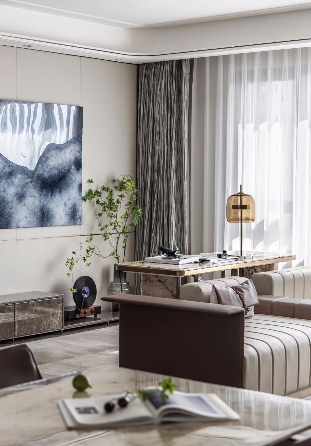 为了记录旅行沿途的足迹,选取有纪念意义的植物化作星星点点的植物标本,让家的一处承载着乐趣,生活的颜色也逐渐变得更加丰富起来。大自然的每一个领域都是美妙绝伦的,每一处细节都散发着温润的气息,在沉静轻松的氛围中纾解生活的繁碌,与自然对话,为平凡生活注入生机与律动,迸发着生机的自然元素将原始的生活理想装入居所。时间如长河,在这条长河里,我们如旅人般,匆匆也好,信步也好,看着沿途的风景,或多或少的留下了自己的足迹。寻一处静谧之处,构建理想家园,再用时间去回味沿线风景。延伸的直线条,引导着视线,勾勒精致的空间构造,随时间与距离的拉伸,最终归于一点。斜阳入室,光影折射,穿透时间,落座于空间之中。视感、听感、触感随之发生变化。将时间定格于此,让身心惬意畅快。经典始终是经典,不会随时间流逝而褪去原本的光环。高级感亦是如此。皮革、绢布、金属的绝佳搭配,各司其职扮演着自己的角色。![]()