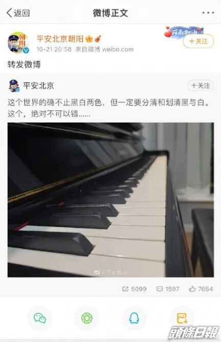 北京市公安局的“平安北京”微博则刊出一张钢琴琴键的照片,还留言:“这个世界的确不止黑白两色,但一定要分清和划清黑与白,这个绝对不可以错。”