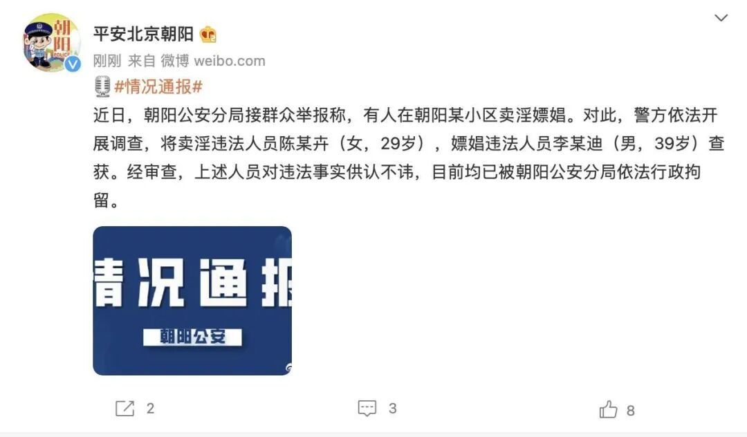 综合各媒体引用隶属于北市公安局朝阳分局的“平安朝阳”微博报道:近日北京朝阳公安分局接群众举报称,有人在朝阳某小区卖淫嫖娼。对此,警方依法展开调查,将卖淫违法人员陈某卉(女,29岁);嫖娼违法人员李某迪(男,39岁)查获。经审查,上述人员对违法事实供认不讳,目前均已被朝阳公安分局依法行政拘留。