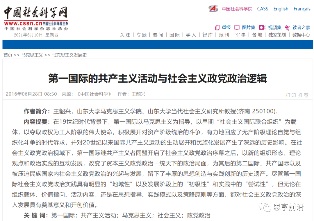 Against the backdrop of the 19th century, the First International, guided by Marxism, emerged in the form of the early “International Socialist Federation.” It viewed the seizure of power as the great mission of the proletariat, actively struggled against bourgeois regimes, strongly responded to the call of times for the theoretical self-consciousness and organized struggle of the proletariat, and exerted a profound historical influence on the stirring inauguration and nationally oriented development of the international Communist movement of the 20th century. From the socialist party political perspective, the First International, once the Communist League, had raised the curtain on socialist party politics, changed the political mode of capitalist party politics’ exclusive world domination through the interactive development of new organizational forms, theoretical viewpoints and political practice. It thus left an abundant historical legacy in terms of ideological creation and practical innovation for the subsequent Second International, the Communist International and the emergence and development of socialist party politics within nation-states. Although its socialist party political practice had an obvious “regional,” “preliminary” and “tentative” nature, the First International had foundation-laying significance and pioneering value for orientation and activity content, or in terms of ideological guidance, practical patterns and strategic principles.