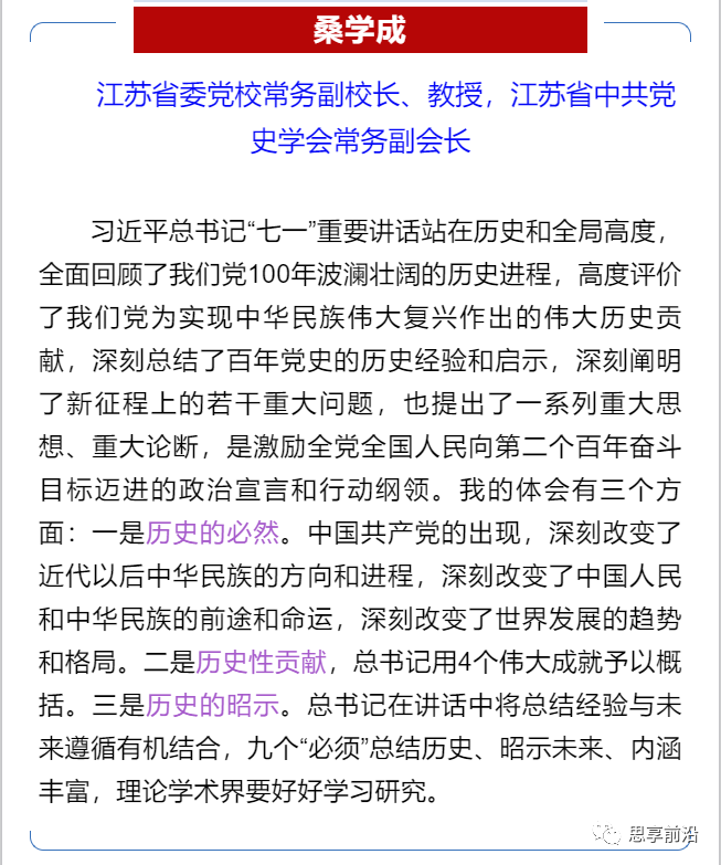 “中国共产党的一百年是为中国人民谋幸福、为中华民族谋复兴的一百年。”马克思主义学院副院长陈曙光说,一百年来,中国共产党创造了新民主主义革命的伟大成就,为实现中华民族伟大复兴创造了根本社会条件;创造了社会主义革命和建设的伟大成就,为实现中华民族伟大复兴奠定了根本政治前提和制度基础;创造了改革开放和社会主义现代化建设的伟大成就,为实现中华民族伟大复兴提供了充满新的活力的体制保证和快速发展的物质条件;创造了新时代中国特色社会主义的伟大成就,为实现中华民族伟大复兴提供了更为完善的制度保证、更为坚实的物质基础、更为主动的精神力量。