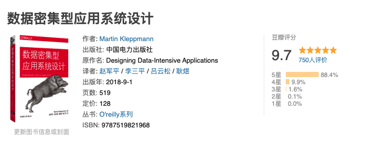 《Designing Data-Intensive Application(数据密集型应用系统设计)》这本书强推一波,值得读很多遍!豆瓣有接近 90% 的人看了这本书之后给了五星好评。另外,中文翻译版本已经在 Github 开源,地址:https://github.com/Vonng/ddia[3] 。