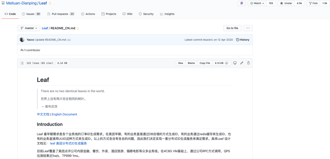 Leaf[10] 是美团开源的一个分布式 ID 解决方案 。这个项目的名字 Leaf(树叶) 起源于德国哲学家、数学家莱布尼茨的一句话:“There are no two identical leaves in the world”(世界上没有两片相同的树叶) 。这名字起得真心挺不错的,有点文艺青年那味了!