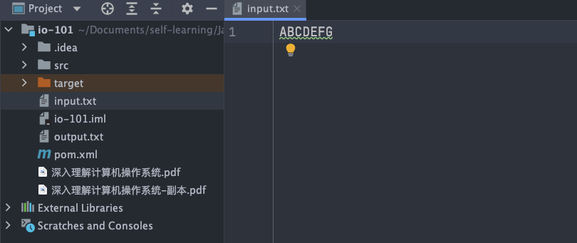 乱码问题这个很容易就可以复现,我们只需要将上面提到的 FileInputStream 代码示例中的 input.txt 文件内容改为中文即可,原代码不需要改动。