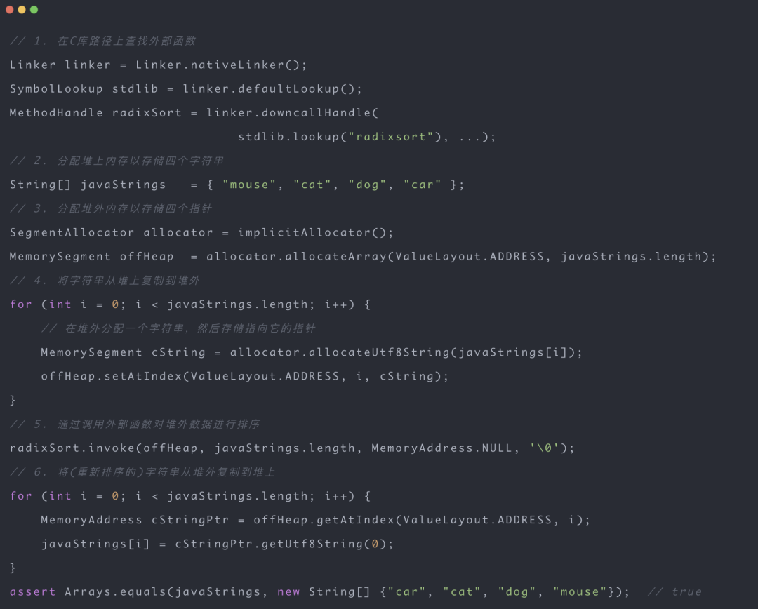 MemorySegment、、MemoryAddress和SegmentAllocator);MemoryLayout, VarHandle;MemorySession;Linker、FunctionDescriptor和SymbolLookup。下面是 FFM API 使用示例,这段代码获取了 C 库函数的 radixsort 方法句柄,然后使用它对 Java 数组中的四个字符串进行排序。
