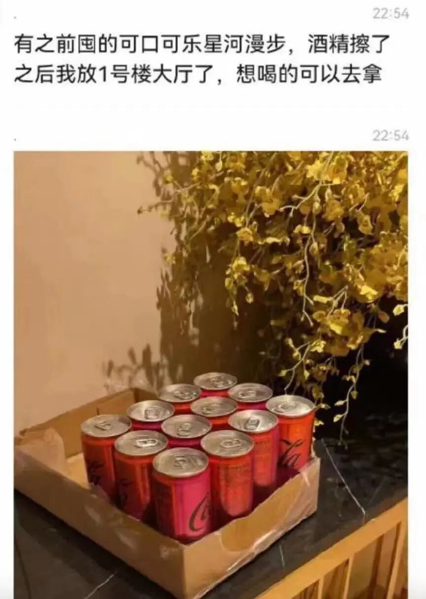 有业主在楼下大厅放了12瓶可口可乐,让邻居们随便拿。
