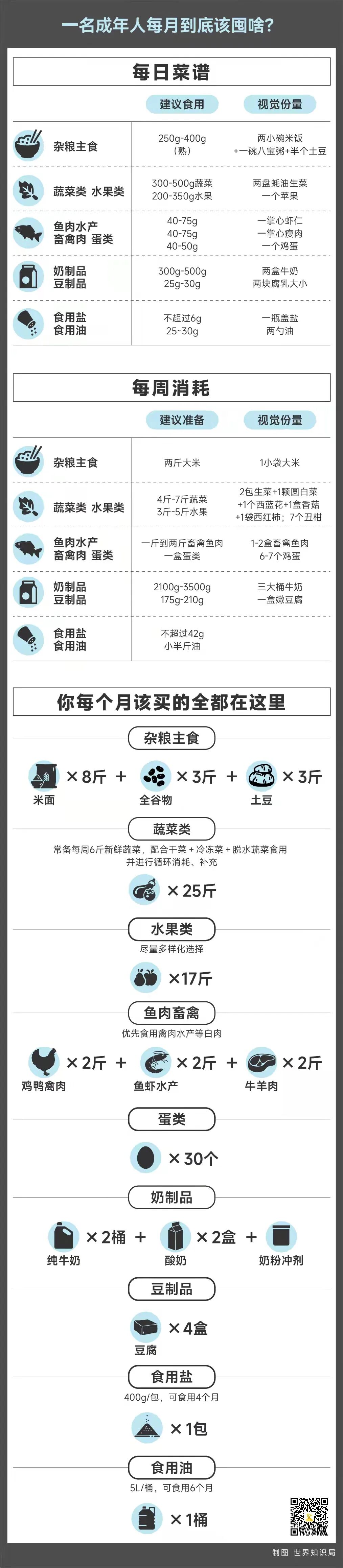所以我们按照中国膳食指南,按照一名成年人的日常营养搭配,拟定了一份囤菜计划。