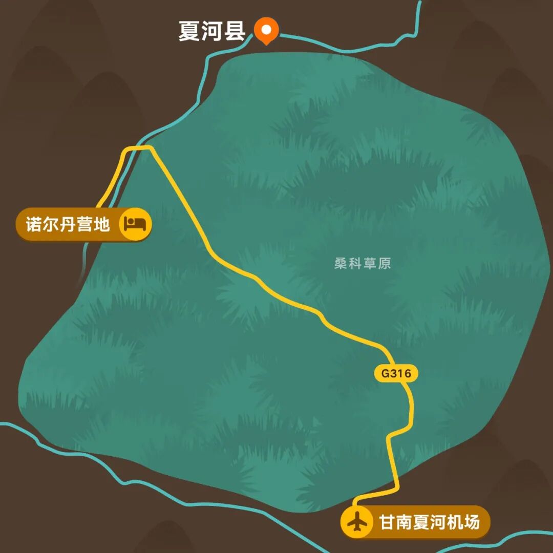 交通方式二:如果从西安或者成都前往,更可以直接飞抵距离营地60km的夏河机场。由夏河机场搭车或者预约酒店接机不到1小时可以抵达。这条线路将穿越整片桑科草原,非常不错的体验。