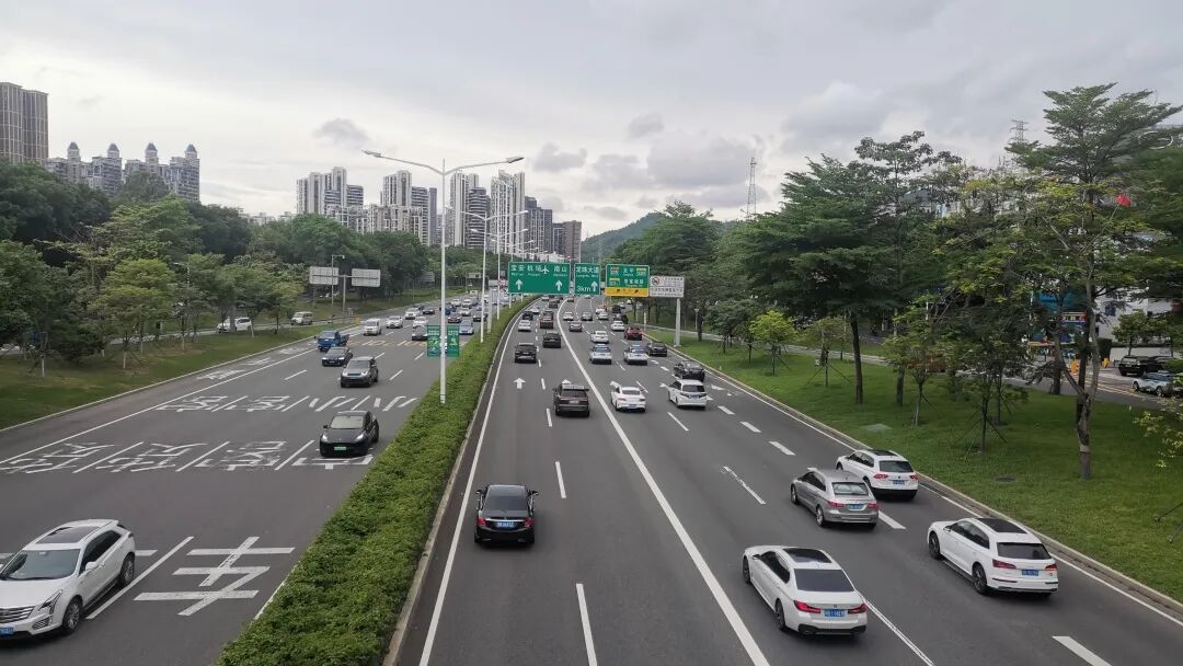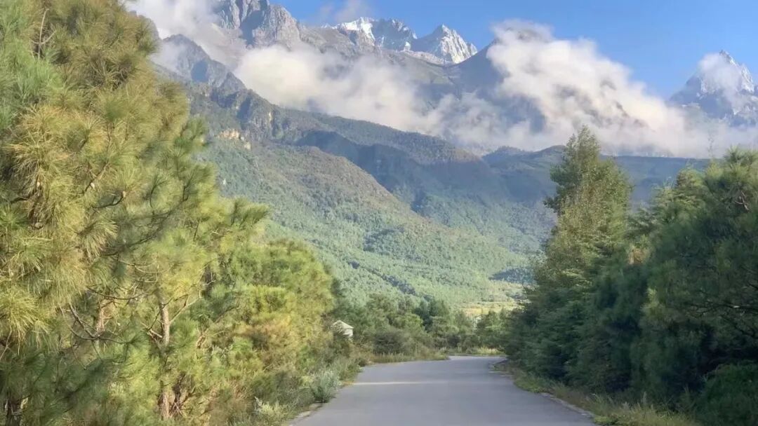 从丽江市区去往景区的路不再拥堵,远处是玉龙雪山