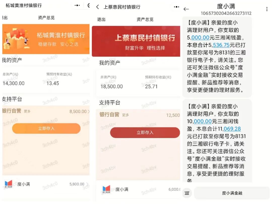 再看另外三家银行的小程序,分别是柘城黄淮村镇银行、开封新东方村镇银行、上蔡惠民村镇银行,都已经无法将存款取出。