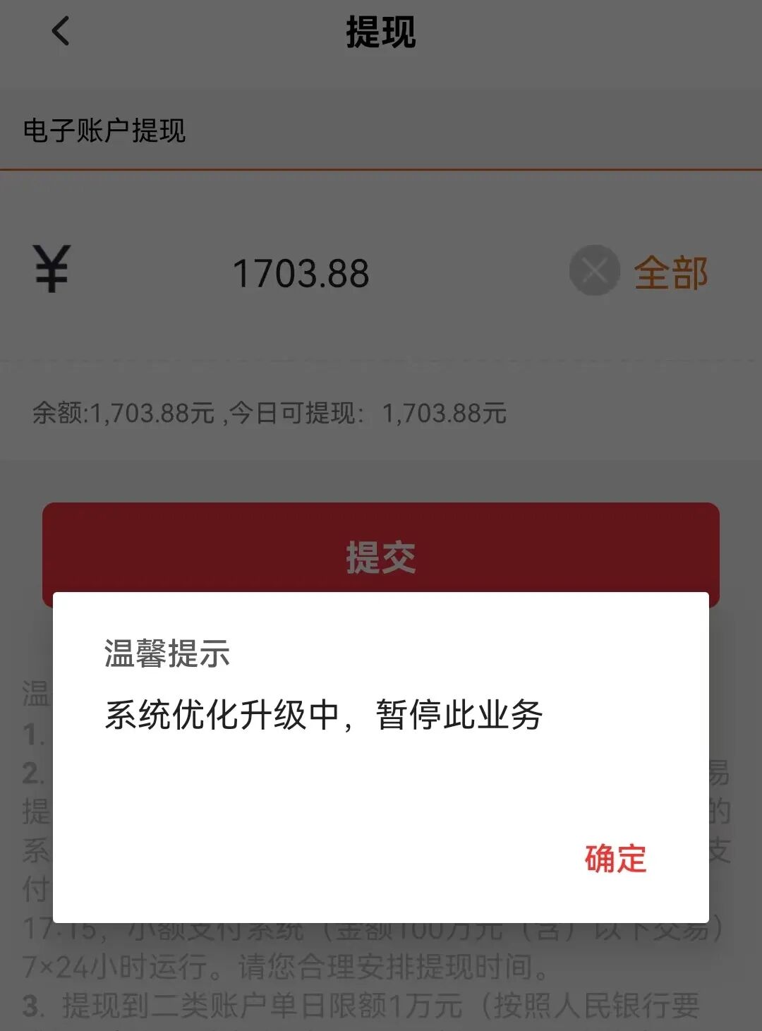 取现时提示“系统优化升级中”