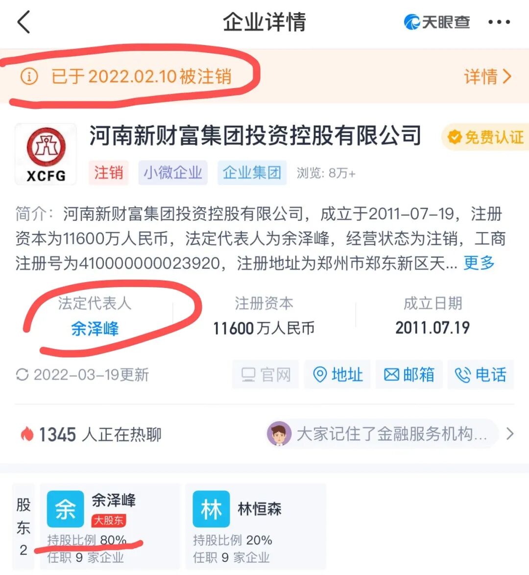 余泽峰是谁?正是河南新财富集团的法人、持股80%的股东。