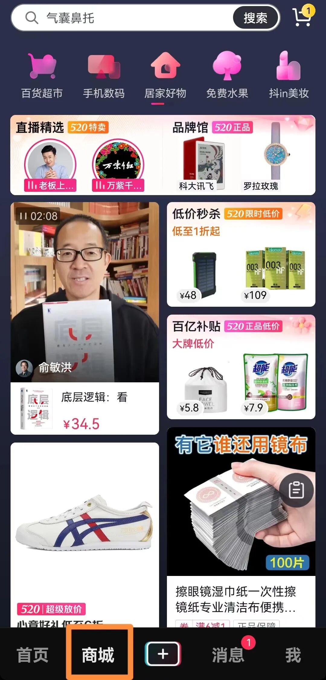 如今的抖音商城界面,首页配备了“直播精选”“品牌馆”“低价秒杀”等类目,已与传统的货架式电商别无二致。颠覆了以往抖音“货找人”的模式,转而依赖起用户的主动搜索,即“人找货”。