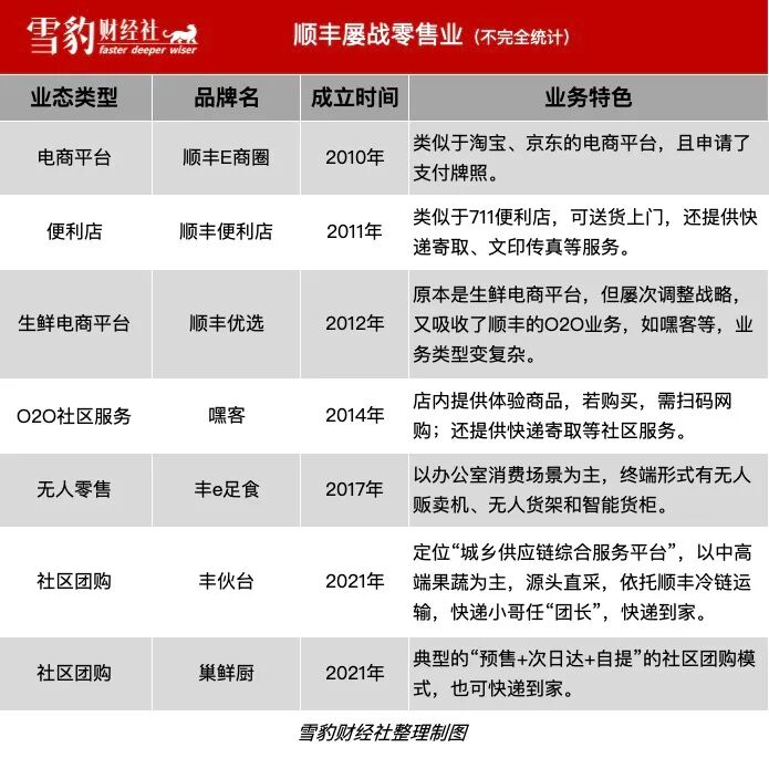 12年来,顺丰对新零售十分执着,屡败屡战:几乎集齐了新零售的所有业态,包括便利店、电商、生鲜电商、社团团购、社区小店等。