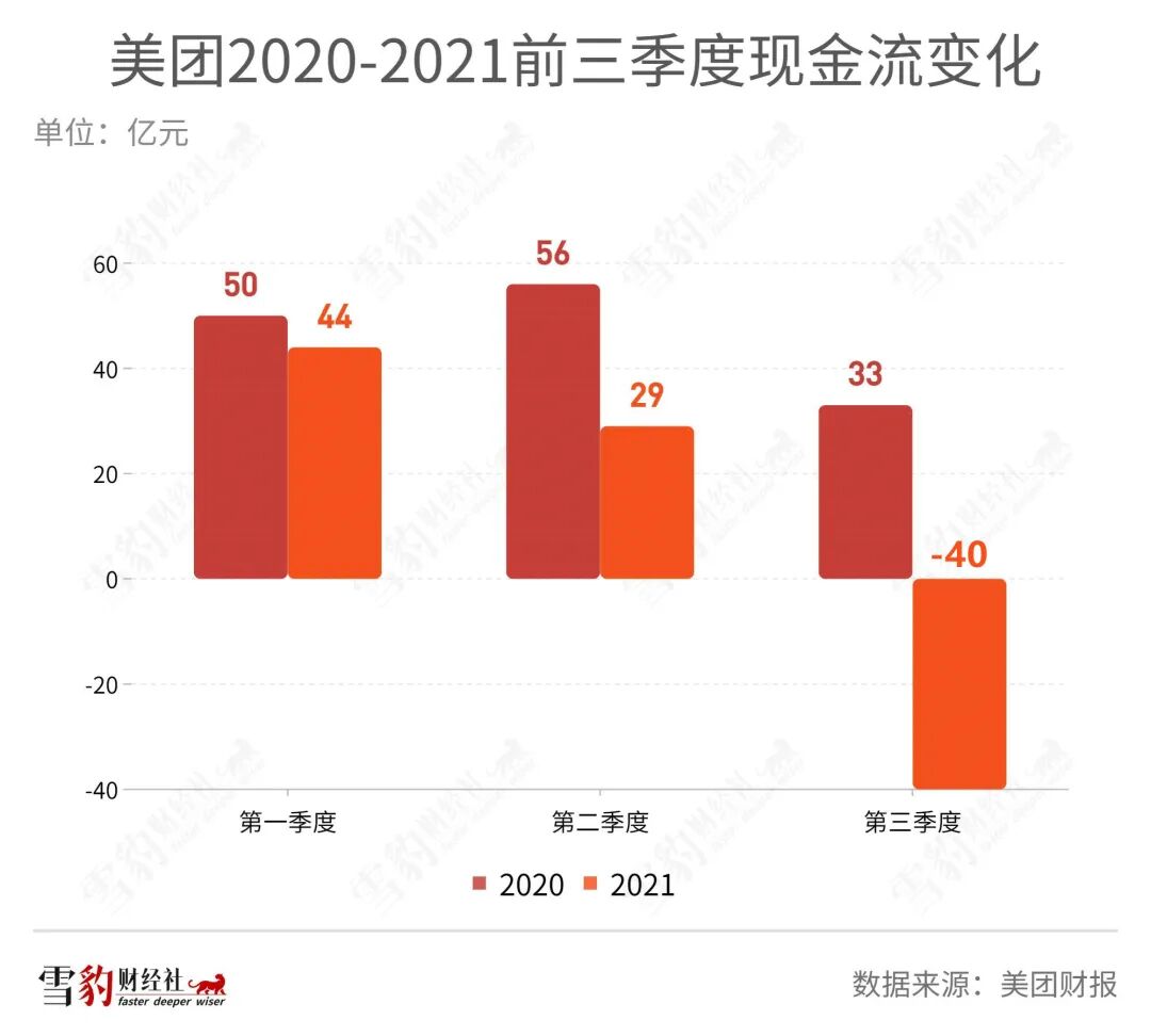 目前来看,新业务持续的巨额亏损已经开始影响到美团的现金流了。2021年前三季度经营活动现金流从2020年同期的流入50亿元、56亿元、33亿元降低至流入44亿元、29亿元、-40亿元。未来,餐饮外卖这一“输血端”都可能盈转亏,美团现金流的压力只会加剧。