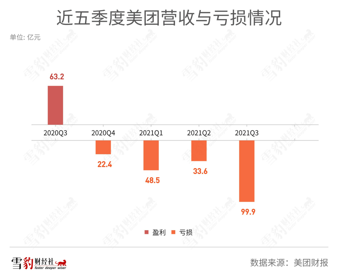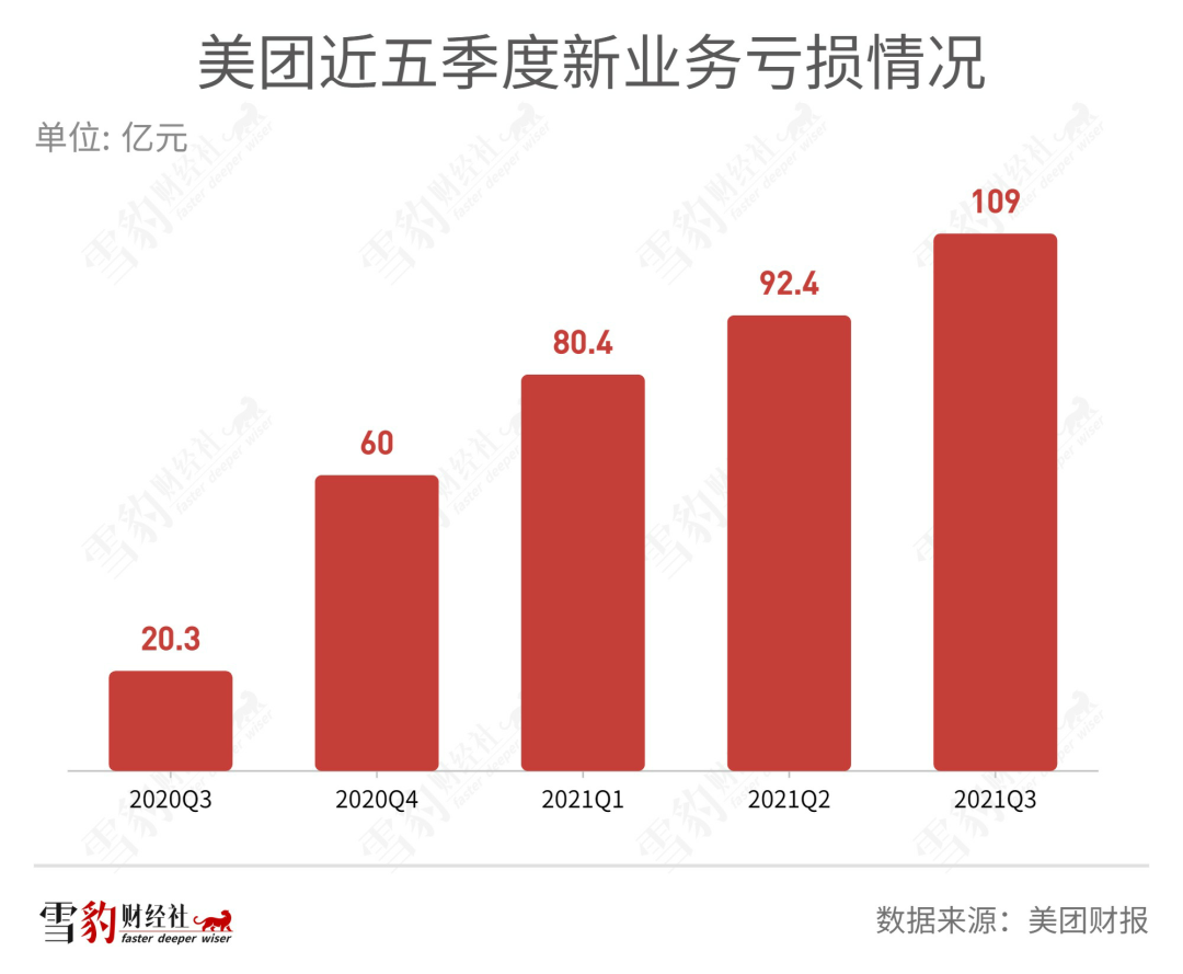 2021年Q3,美团新业务营收137亿元,但亏损高达109亿元,仅这一单季度亏损就几乎与2020年全年的亏损一致。从2020年Q3以来,新业务已连续五个季度累亏超362亿元,不但轻松吞下了餐饮外卖和到店酒旅的“血汗钱”,也是拖累美团整体连续四个季度亏损的“罪魁祸首”。