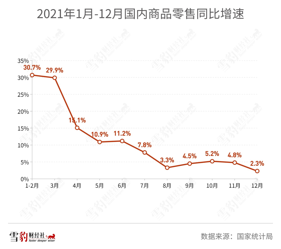 据国家统计局的数据,2021年国内商品零售增速逐渐放缓,10月-12月的增速分别为5.2%、4.8%、2.3%,与年初甚至上半年相比,降速明显。