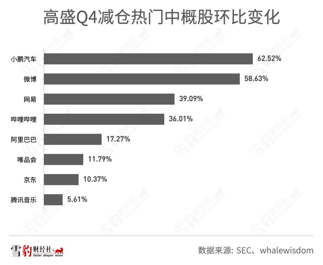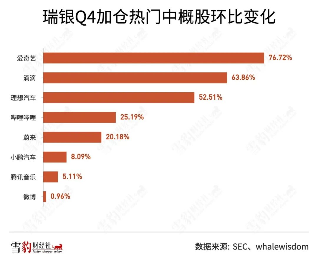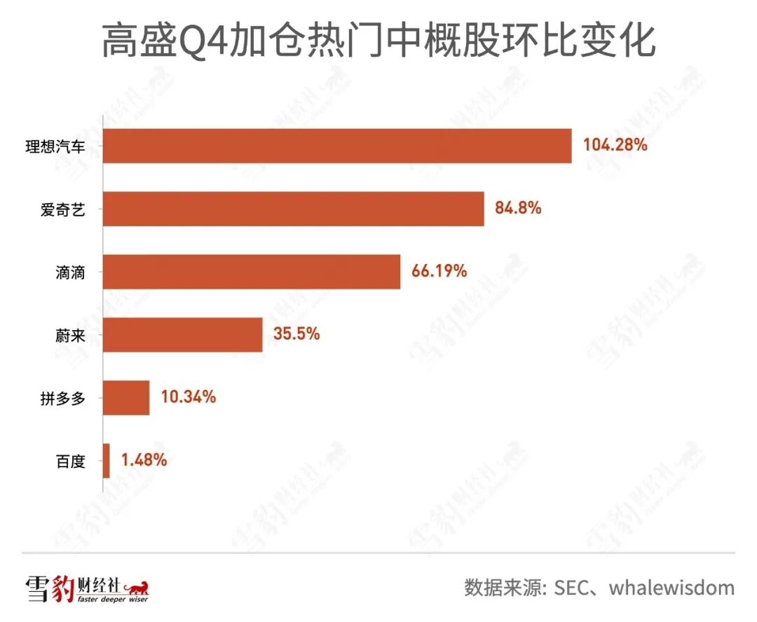 以持仓中概股闻名的高瓴资本,Q4通过旗下对冲基金HHLR Advisor持仓76只美股,持仓总市值为64.72亿美元,环比下滑15.35%。