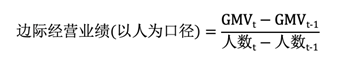 数据不说谎,人效指标是组织能力的最佳代言,是验证组织模式优劣的关键指标。这里,我们不妨再考虑一个穆胜咨询定义的人效类指标——边际经营业绩(以人为口径)。简单说,就是每追加一个人,能够带来多少的GMV/营收。具体公式如下: