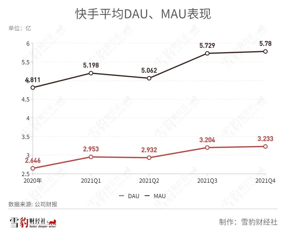 2021年四季度,快手的平均DAU(日活用户量)、MAU(月活用户量)分别为3.233亿、5.78亿。而三季度的平均DAU、MAU分别是3.204亿、5.729亿;四季度分别微增290万与510万。