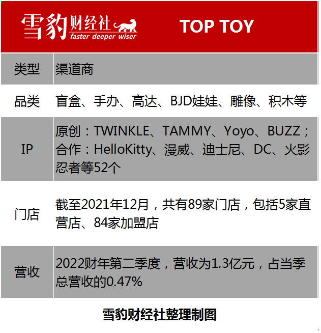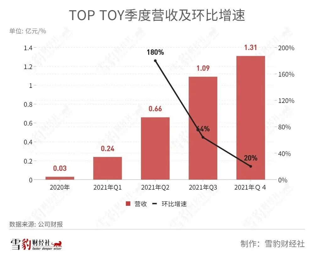 2022财年第二季度(截止2021年12月31日),TOP TOY实现营收1.3亿元,占名创优品当季总营收的0.47%。2021自然年的后三个季度,TOP TOY营收环比增速直线下滑。