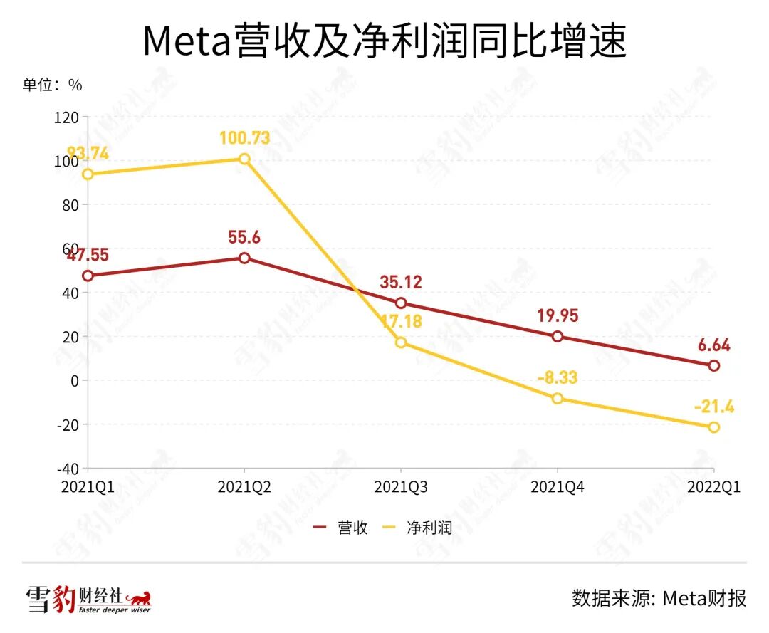 Meta两组数字分别从去年同期的47.6%、93.7%降至今年Q1的6.64%及-21.4%。