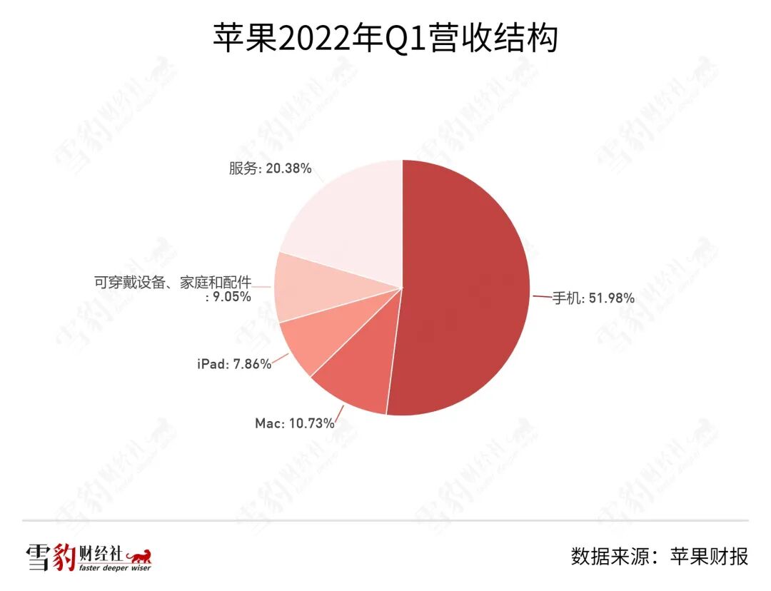 即使是大众心中偏硬件制造的苹果公司,本质上也是一家软硬件结合的公司,其当家主力iPhone营收占比为52%,而软件服务则贡献了超20%的营收。