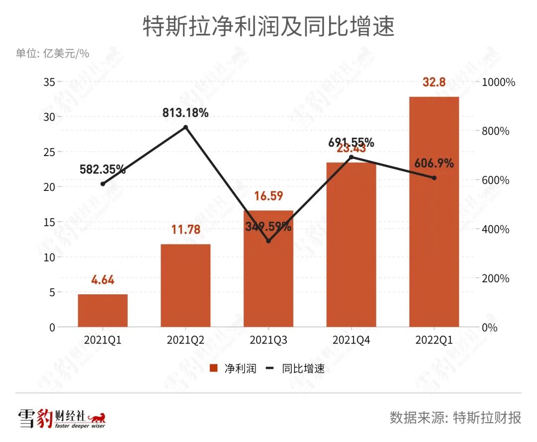 特斯拉2021年全年的净利润“光速”上涨:同比增长554.8%至56.44亿美元。2022年Q1,特斯拉净利润依然保持增势,同比增长607%至32.8亿美元。