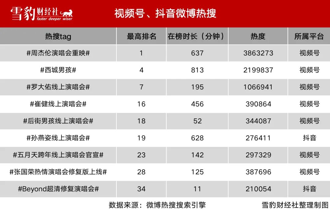 从微博热搜来看,二者演唱会的声量也差距明显。同一天上线的罗大佑线上演唱会,在微博热搜上在榜195分钟,最高排名位列热搜第7,而孙燕姿演唱会最高只排到19名,热度不到罗大佑演唱会热搜的三分之一。纵观二者过去几场演唱会的热搜数据,前五名均被视频号占领。