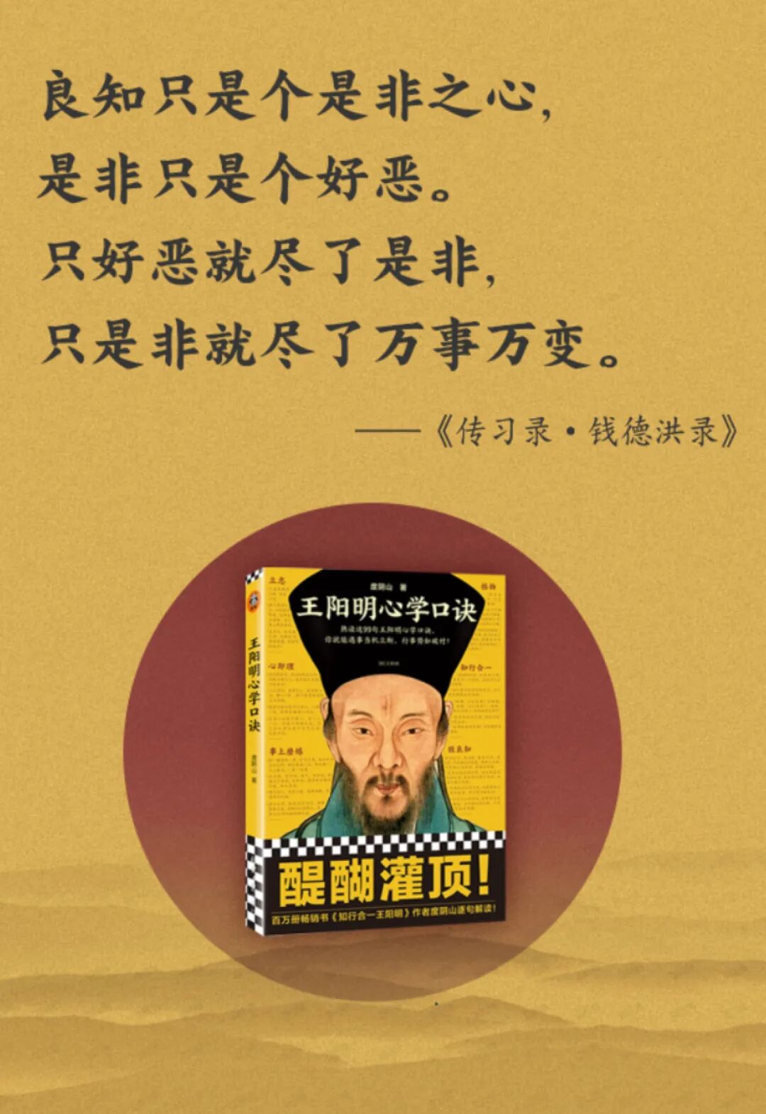 就能帮助我们在面对嘈杂的世界时保持清醒,时刻做出最正确的事情!因为对于普通人来说,这套书最生动,最全面,也最系统。它一共有五本,分别是王阳明的传记,王阳明的四句教诲,王阳明的传世家训!对王阳明代表作《传习录》的解读,《传习录》的原文。当然,如果你想真正达到知行合一的最高境界,就一定绕不开王阳明的代表作——《传习录》。这套书的最后两本,即《传习录》的原文,以及对《传习录》的生动解读。很多人表示,阳明心学帮他们解决了“道理我都懂,但依然过不好这一生”的困境,行动力暴涨!还有人表示:想把王阳明系列再看一遍,把金句抄下来定期翻阅。但想到这套书的厚度,小编觉得,与其让大家辛苦摘抄,不如请作者亲自操刀。于是我们飞奔找到了度阴山老师,跪求他写了这本超精华、超干货的《王阳明心学口诀》!精挑99句至理箴言并配以精辟解读,浓缩成了这本通俗易懂、可以每天练习的随身读物。让你在轻松阅读中,掌握获得“知行合一”的智慧,遇事当机立断,行事势如破竹!第一遍看的时候,只顾得上理解故事和王阳明的心学智慧,读完了才发现什么都没记录,想细品只能再读一遍。虽说好书不厌百回读,但这一大套书再看一遍还真不容易……于是小编请到了作者度阴山老师,亲自出马精选了99句超干货心学口诀。每句都是至理箴言,涵盖了心学核心要点。熟读这99句,就掌握了心学最精华的部分!如果说《知行合一王阳明》是了解阳明心学最好的教科书;那《王阳明心学口诀》就像是准备期末复习时的老师画好重点的背诵宝典。度阴山老师穷尽王阳明所有著作,选出了既能体现思想精华、又通俗易懂的句子。良知只是个是非之心,是非只是个好恶。只好恶就尽了是非,只是非就尽了万事万物。