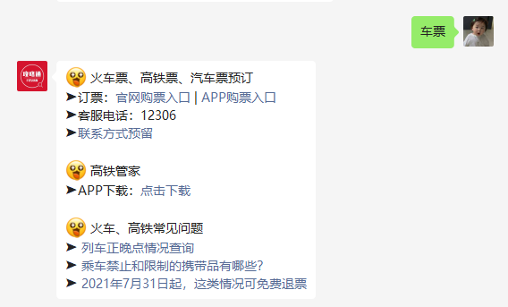 在主页对话框回复【车票】