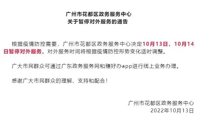 根据疫情防控需要,广州市花都区政务服务中心决定10月13日、10月14日暂停对外服务。对外服务时间将根据疫情防控形势变化适时调整。
