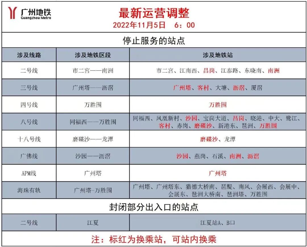 - 11月5日运营时间起,二、三、四、八、十八、广佛线、APM线涉及海珠区内的所有地铁车站和有轨电车均停止对外服务,其中涉及的换乘站保留站内换乘功能。