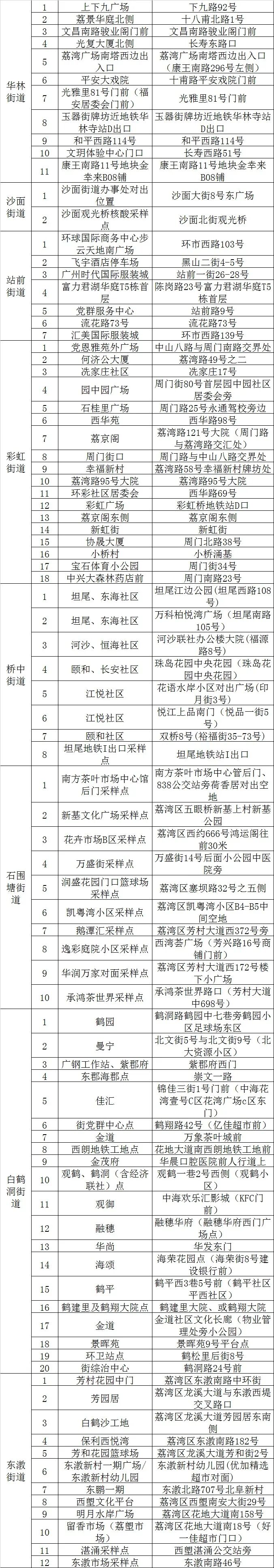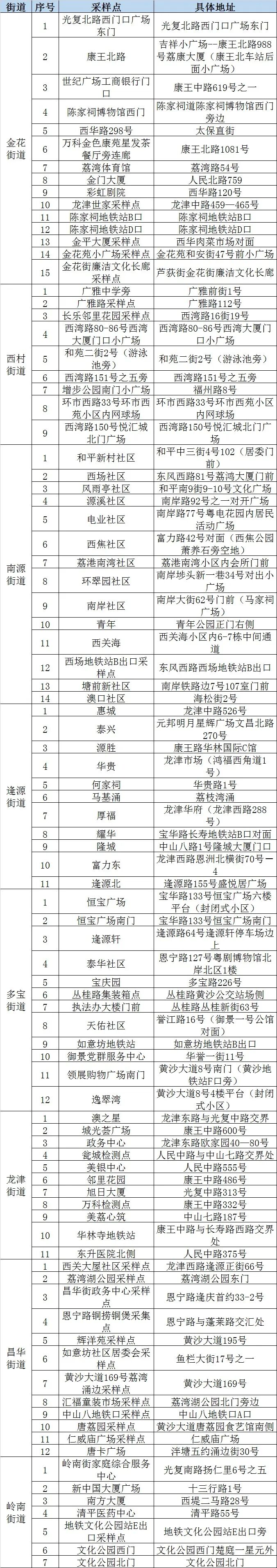 定于11月5日在金花、西村、南源、逢源、多宝、昌华、岭南、华林、沙面、龙津、彩虹、站前、桥中、石围塘、白鹤洞、东漖街道启动全员核酸检测工作。