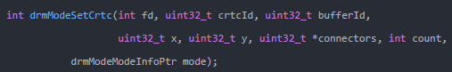 CRTC模式设置函数:drmModeSetCrtc(),参数为:fd、crtc句柄、FB句柄、X\Y坐标等。