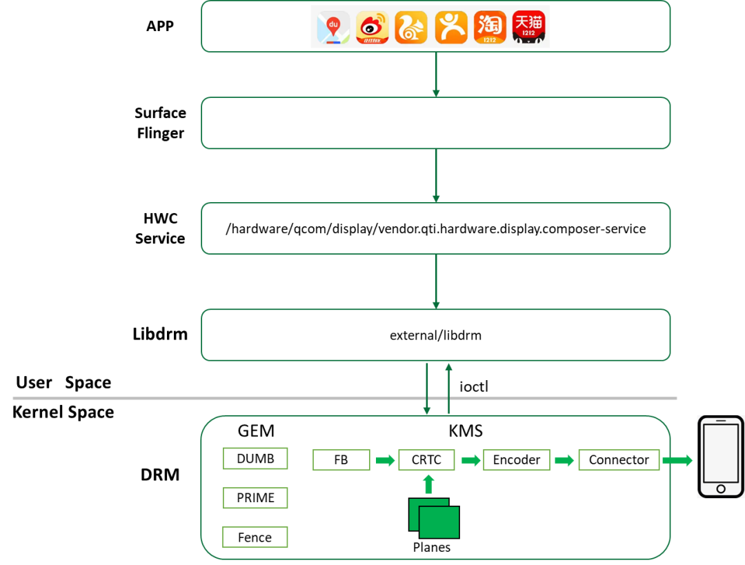 本章节介绍DRM框架中的一些重点模块的功能与在显示链路中的作用,下图为APP调用DRM到屏幕显示的流程框图。