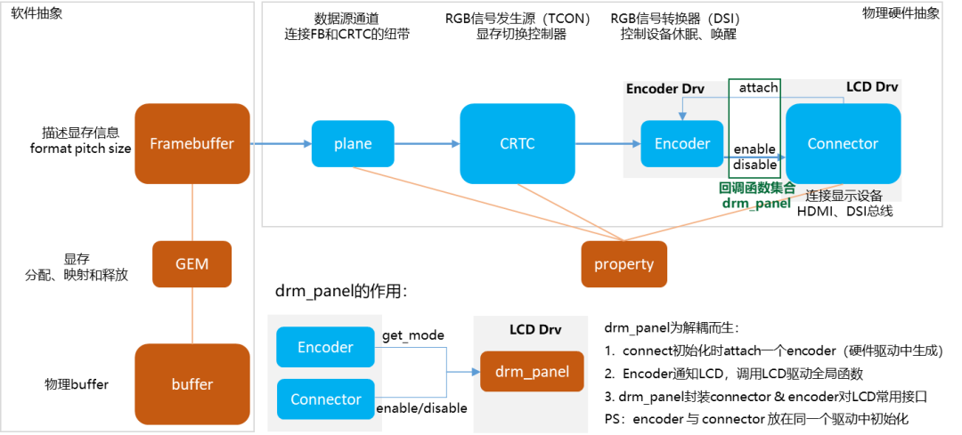 DRM的objects并不难理解,重要的是如何将实际的硬件与这些object进行关联,下面会以MIPI DSI接口为例进行介绍软件架构与DRM object的对应关系。