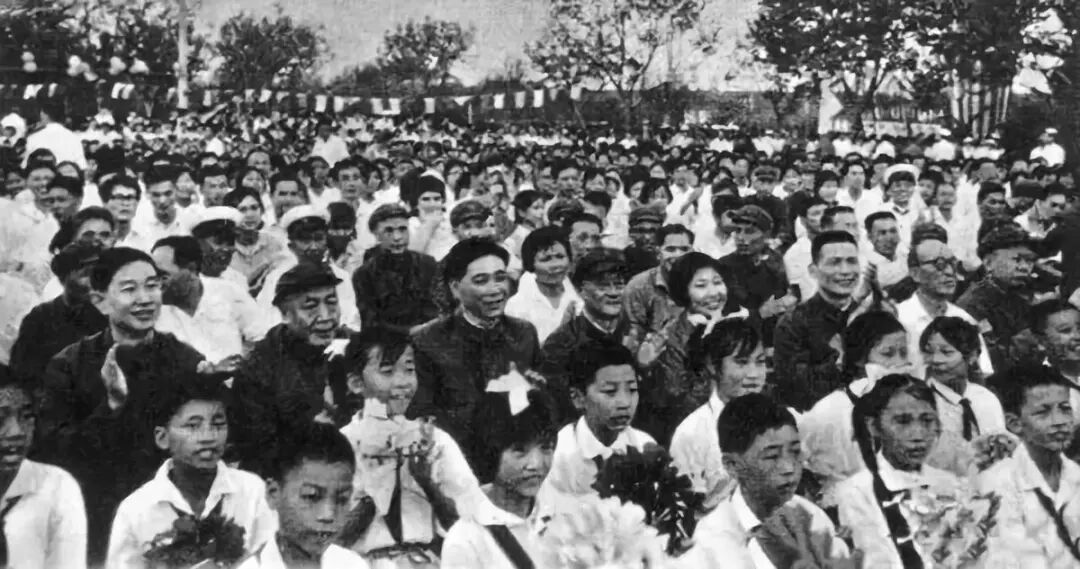 1956年1月20日,上海市在中苏友好大厦举行资本主义工商业申请公私合营大会,左一为荣毅仁。