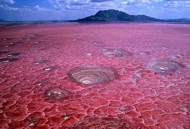 纳特龙湖是碱水湖,水深低于3公尺,周围火山经常爆发,火山灰落在湖中形成天然化合物"泡碱",水温高达50度。