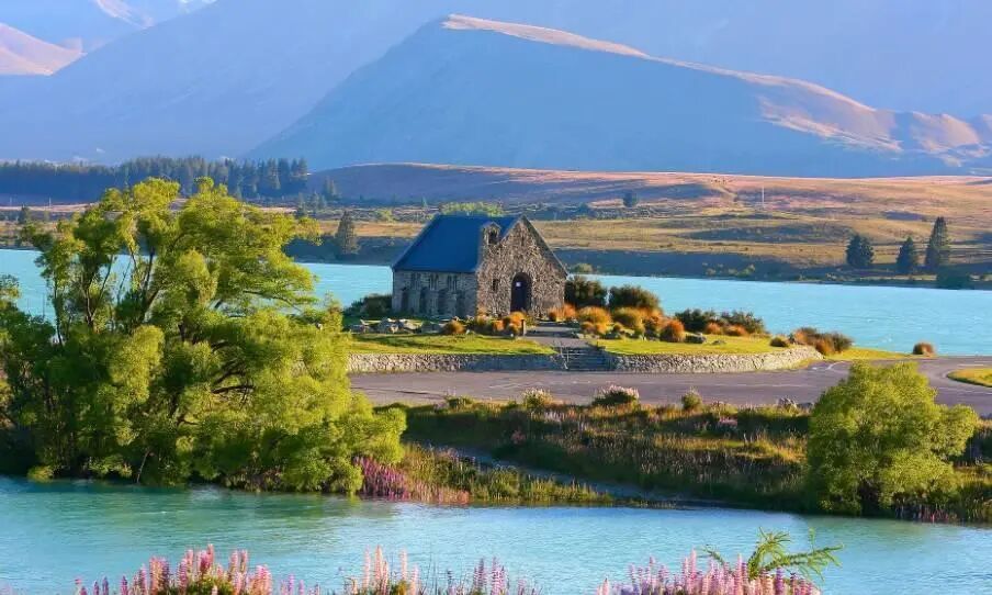 新西兰蒂卡波湖位于新西兰皇后镇,湖水成的乳蓝色,这个小房子叫"牧羊人教堂",位于三面环水的半岛上,始建于1935年。