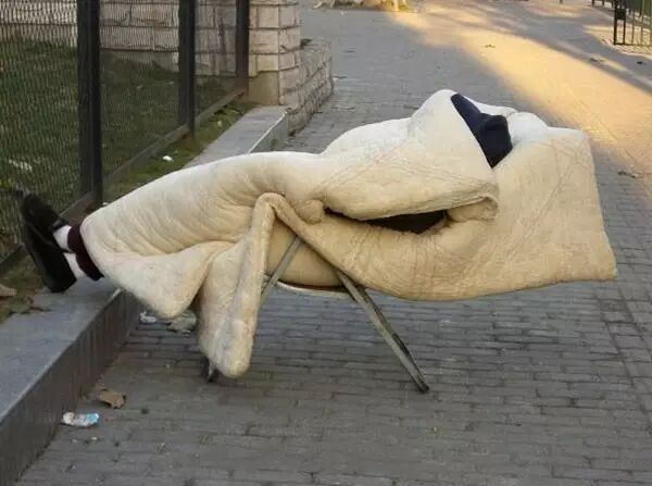 裹着棉絮在大街上入睡,既能晒太阳,又能睡觉,多好!