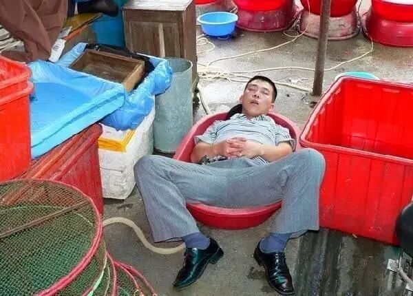 一位水产店的伙计,中午就酣睡在这巨大的红色塑料盆里。