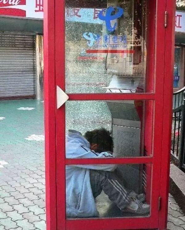 躲在电话亭里睡觉的外来务工人员。