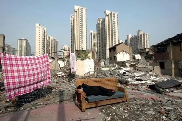 远处拔地而起的高楼,近处正在被拆迁的老房子,一位拆迁户在自家这件破沙发上美美的睡了起来。
